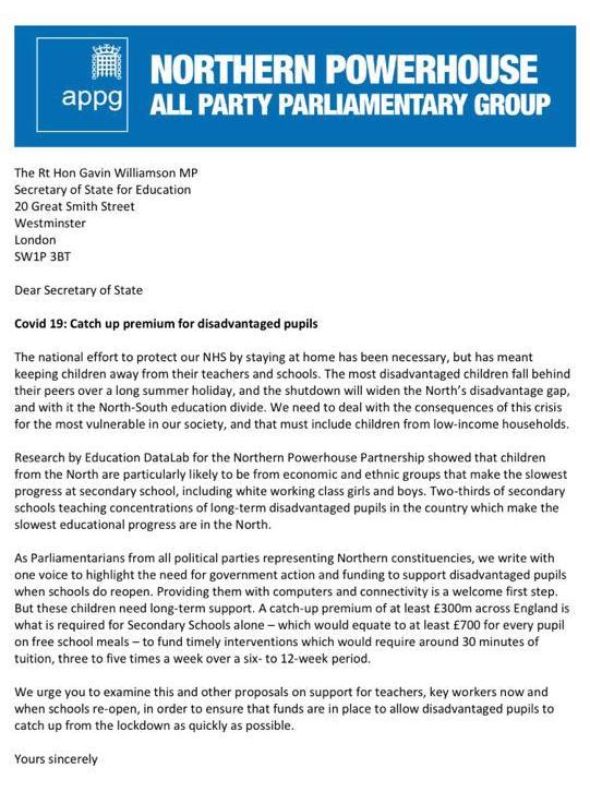 Commenting, Mayor Jarvis said: “I am pleased to support this important and timely campaign by the Northern Powerhouse APPG to ensure that the Coronavirus crisis doesn’t worsen inequality for children from the most deprived backgrounds.